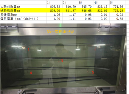 2023年浙江******產(chǎn)品檢驗(yàn)有限公司第二次采購(gòu)我司一臺(tái)型號(hào)為“WHQ-900B”型的混合氣體腐蝕試驗(yàn)箱,設(shè)備在出廠之前,工作人員已經(jīng)在我內(nèi)部的實(shí)驗(yàn)室進(jìn)行過(guò)一次合格的銅片增重測(cè)試,之后設(shè)備被運(yùn)送到客戶指定的場(chǎng)地安裝調(diào)試運(yùn)行。客戶在設(shè)備運(yùn)行了一個(gè)階段后,自行進(jìn)行一次銅片增重試驗(yàn),試驗(yàn)結(jié)束之后客戶將數(shù)據(jù)發(fā)給我司,以下是客戶和我的聊天記錄和客戶第一次做的數(shù)據(jù):